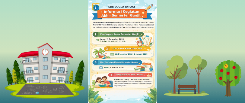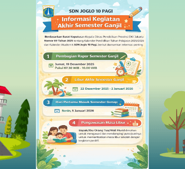 Berdasarkan Kalender Pendidikan dan Kalender Akademik SDN Joglo 10 Pagi Tahun Pelajaran 2025/2026, pembagian rapor Semester Ganjil akan dilaksanakan pada Jumat, 19 Desember 2025 pukul 07.30–10.00 WIB.